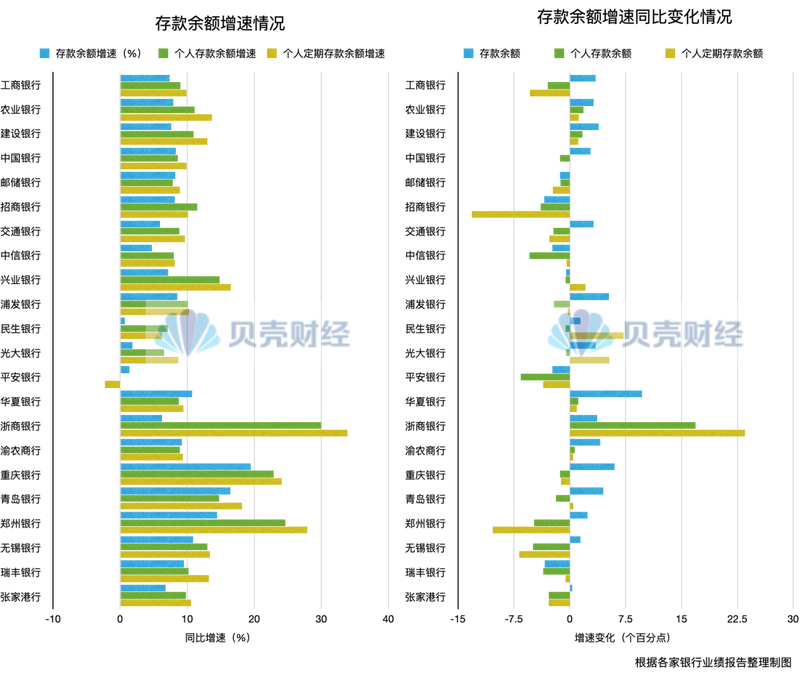 不过,多家银行个人存款和个人定期存款余额的增速确实有所下降。据贝壳财经记者不完全统计,在22家上市银行中,去年有17家银行的个人存款余额增速不及2024年;12家银行的个人定期存款增速低于2024年。